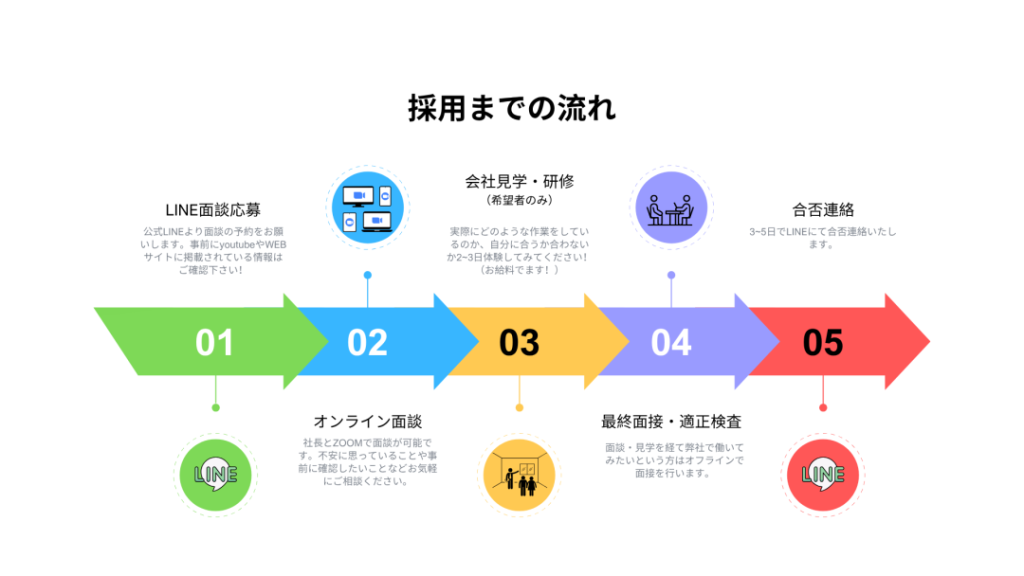 代表とのオンライン面談、会社見学・研修(任意)、最終面接・適正検査を経て選考させていただきます。
